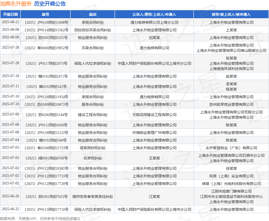 案号:(2025)苏0115民初8589号审理法院:南京市江宁区人民法院案由:服务合同纠纷当事人信息: 原告/上诉人:江苏华泰保安服务有限公司 被告/被上诉人:上海永升物业管理有限公司、上海永升物业管理有限公司南京分公司开庭日期:2025年6月19日根据统计,近一年内以上海永升物业管理有限公司为当事人的历史开庭公告有290则,其中案由为“物业服务合同纠纷”的公告以187则居首,其次为“财产损害赔偿纠纷”有12则,“承揽合同纠纷”有12则。历史开庭公告(前20条)如下: